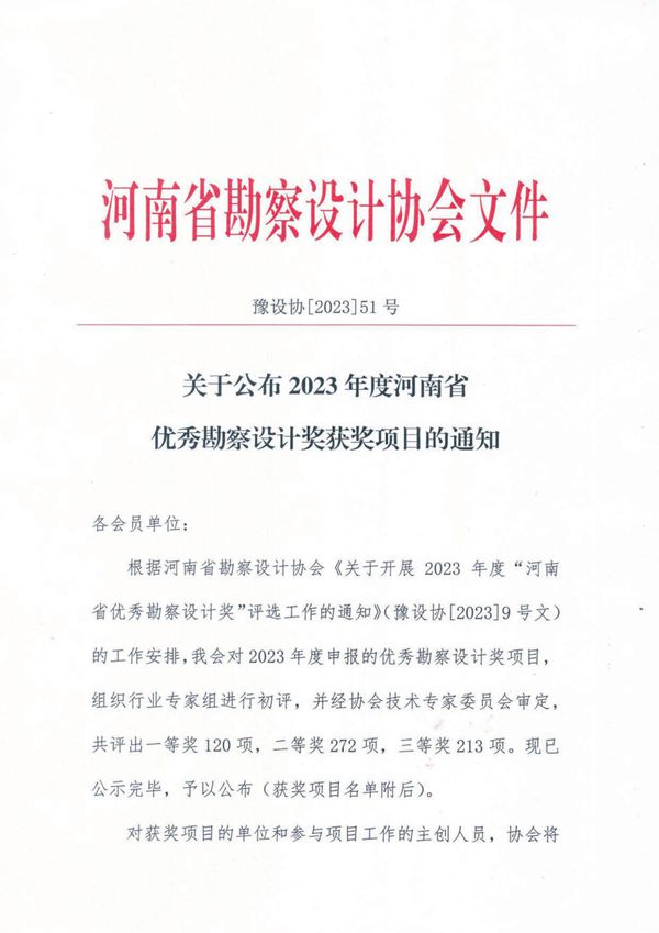 近日,我公司多個項目榮獲2023年度河南省優(yōu)秀勘察設(shè)計獎。