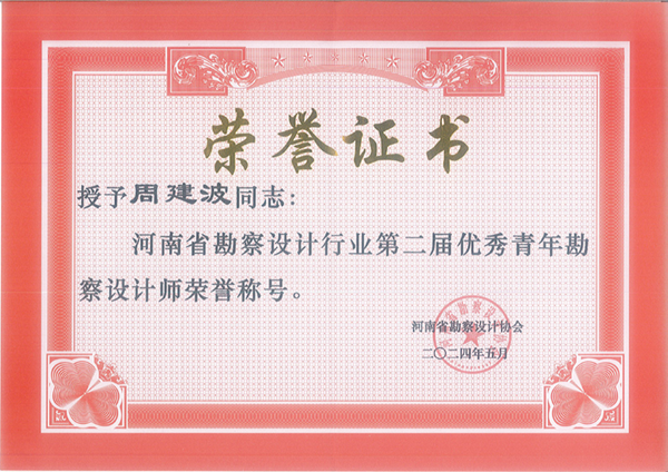 近日,在河南省勘察設計協會第二屆優秀青年勘察設計師認定中我公司周建波同志被評“河南省勘察設計行業優秀青年勘察設計師”。