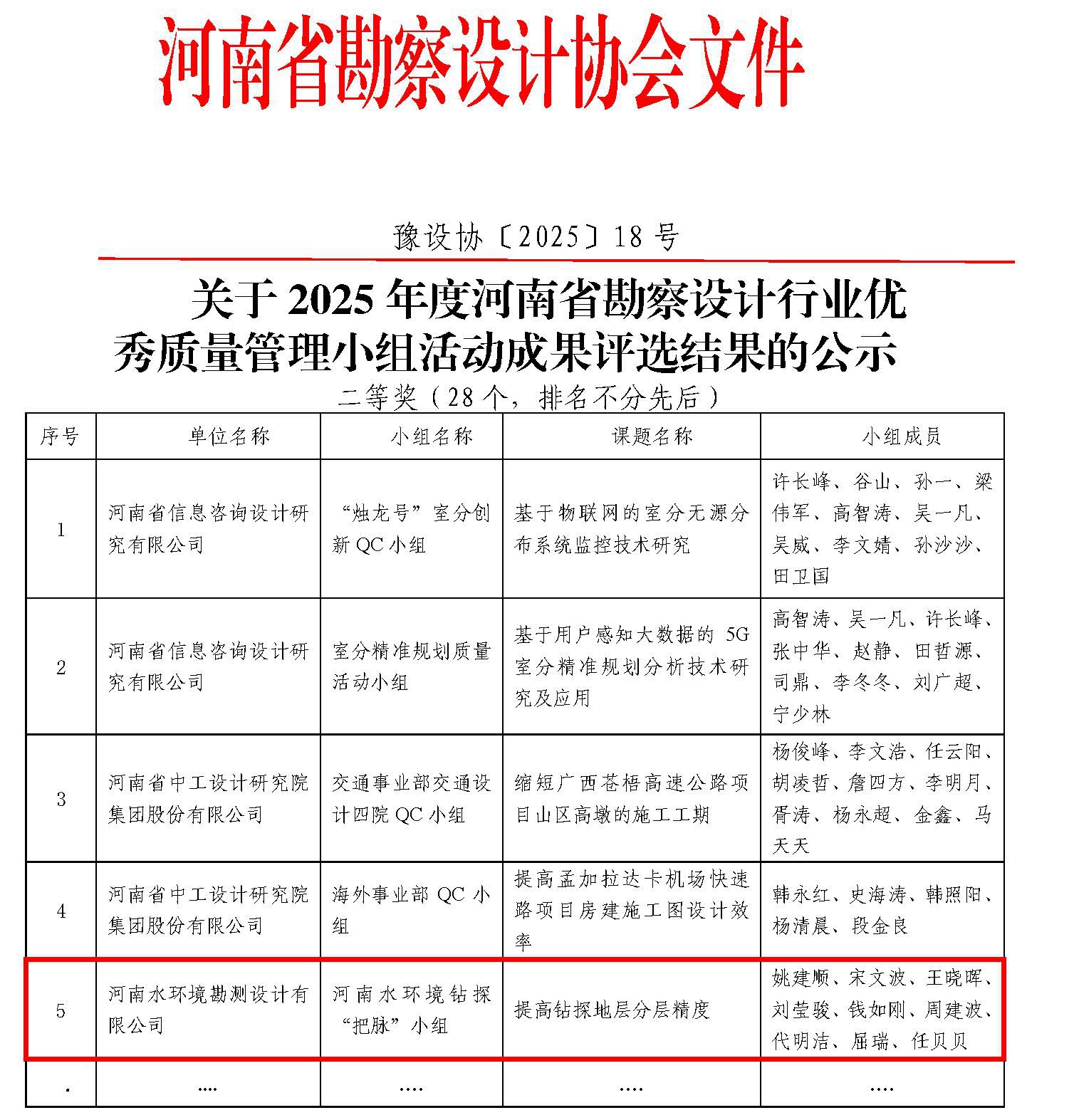 近日,由河南省勘察設計協會組織的2025年度河南省勘察設計行業優秀質量管理(QC)小組活動評選結果揭曉。經過前期精心策劃、扎實實施和現場精彩匯報,我公司選送的兩個質量管理小組在激烈競爭中脫穎而出,斬獲佳績!