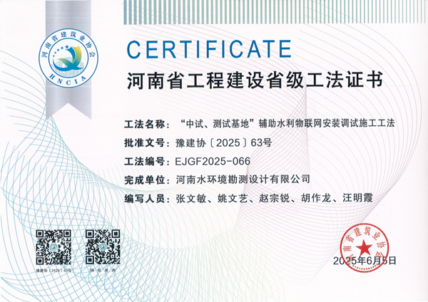 近日河南省建筑業協會發布《關于公布2025年度第一批河南省省級工法的通知》(豫建協【2025】63號),公司申報的河南省工程建設省級工法——“‘中試、測試基地’輔助水利物聯網安裝調試施工工法”獲批!這是我司首次獲得省級工法證書。