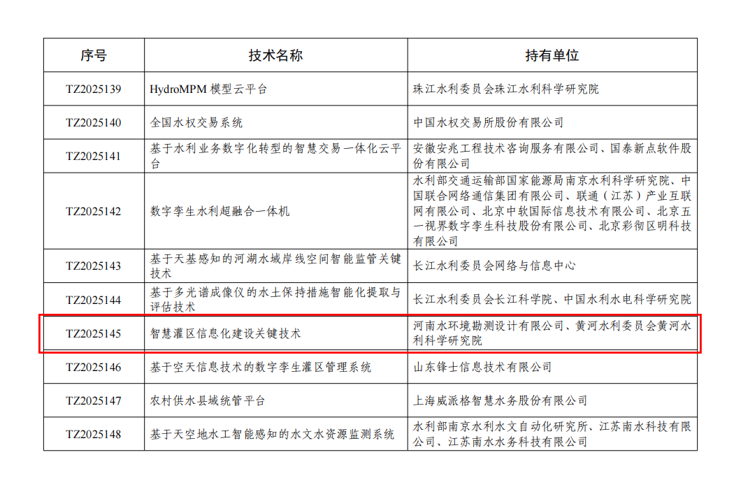 公司智慧灌區信息化建設關鍵技術 成功入選2025年水利部先進實用技術重點推廣目錄